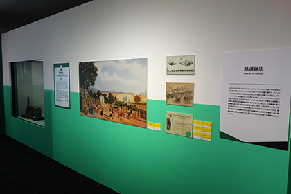 ここでは3つのトピックに分け、「世界初の鉄道誕生」ではイギリスの鉄道開業時の様子を英国国立鉄道博物館(以下、NRM)所蔵の絵画資料(複製)で、「鉄道のひろがり 世界と日本の鉄道車両」では世界各地で主力となった車両をHOゲージ模型で、「日本の鉄道開業」では当時の様子を「イラストレイテッド・ロンドンニュース」や錦絵、引札で紹介しました。
