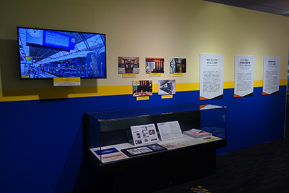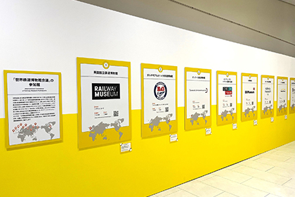 また、世界には鉄道車両やその技術のみならず文化的な側面も含めて保存・活用する施設が多数あります。当館もそうした施設の一つとして役割を全うするために、国内外の鉄道系博物館と連携しています。ここでは、鉄道誕生の地イギリスにあるNRMとの姉妹提携関連資料のほか、「世界鉄道博物館会議」の参加館をパネルで紹介しました。